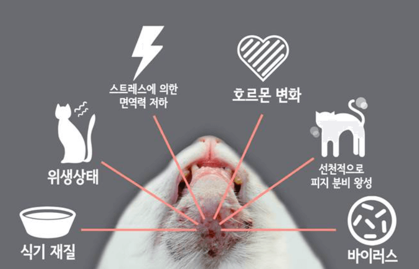 주로 오염된 식기에 의해 많이 생기기 때문에 식기의 종류나 청결 상태가 매우 중요합니다. 식기의 입구가 너무 좁은 것은 고양이가 밥을 먹을 때 식기 가장자리에 턱이나 입 주변이 자꾸 닿게 됩니다. 플라스틱, 스테인리스 재질로 된 것은 깨끗하게 닦아도 흠집이 잘 생기고 그 안에 세균이 쉽게 번식하게 됩니다. 사기나 유리 식기를 사용하고 입구가 충분히 넓은 것을 선택해 사료의 기름성분이 턱에 닿지 않도록 해주시는 것이 중요합니다.
