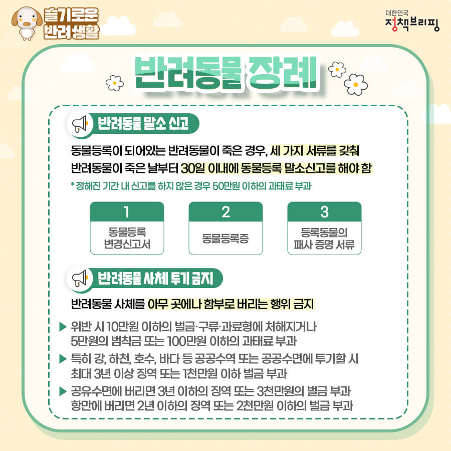 동물등록이 되어있는 반려동물이 죽은 경우, 세 가지 서류를 갖춰 반려동물이 죽은 날부터 30일 이내에 동물등록 말소 신고를 해야 함